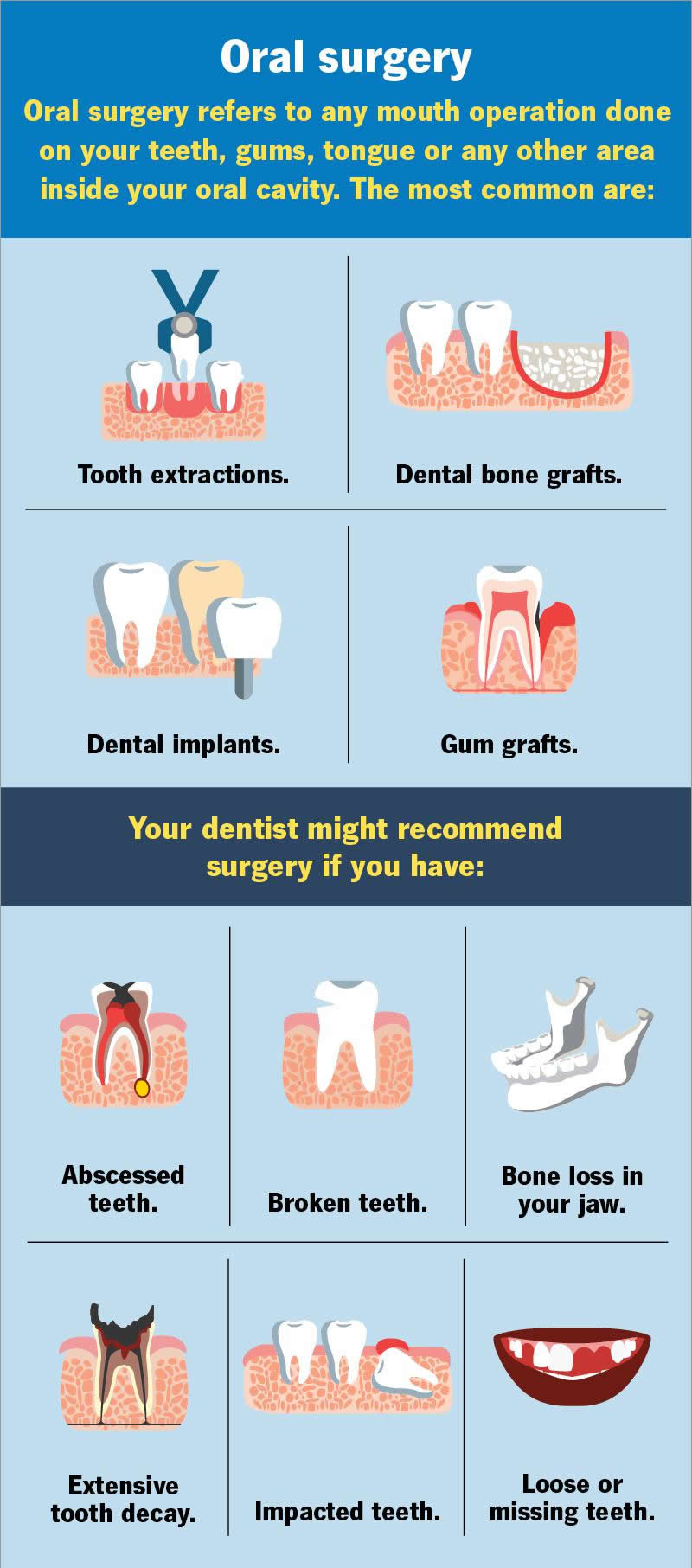 Oral surgery treats conditions that affect your teeth, gums and any other part of your mouth. Common procedures include tooth extractions, dental implants and gum grafting. Oral surgeons usually do treatments in a clinical setting (like an outpatient surgery center). Or they might do the procedure in a hospital if you need general anesthesia.