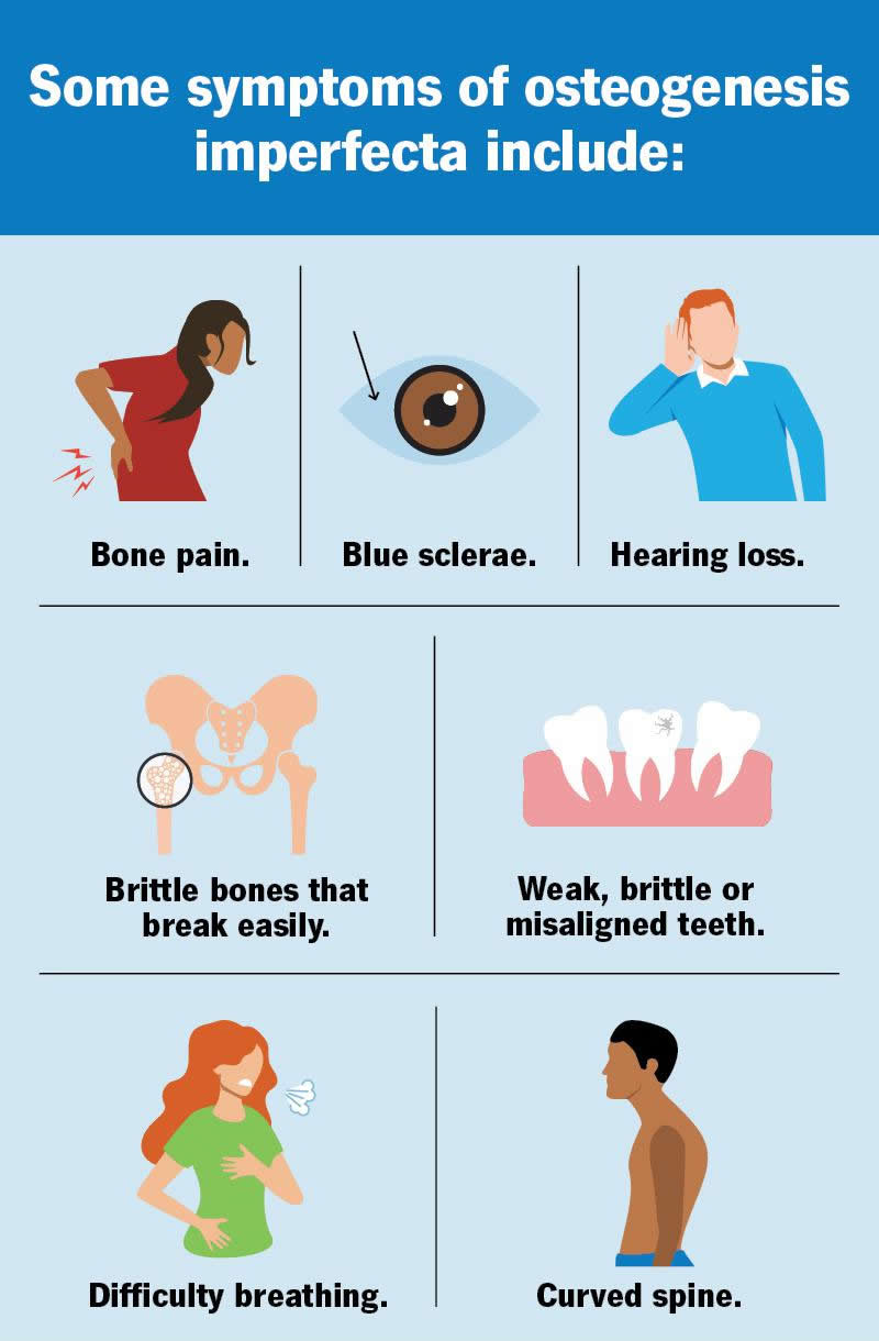 Osteogenesis imperfecta (brittle bone disease) is a genetic disease that makes your bones thin and brittle. People with osteogenesis imperfecta break bones easily, with little or no force causing the break. It can also cause a curved spine, muscle weakness, difficulty breathing and other issues. The most common type causes mild symptoms.