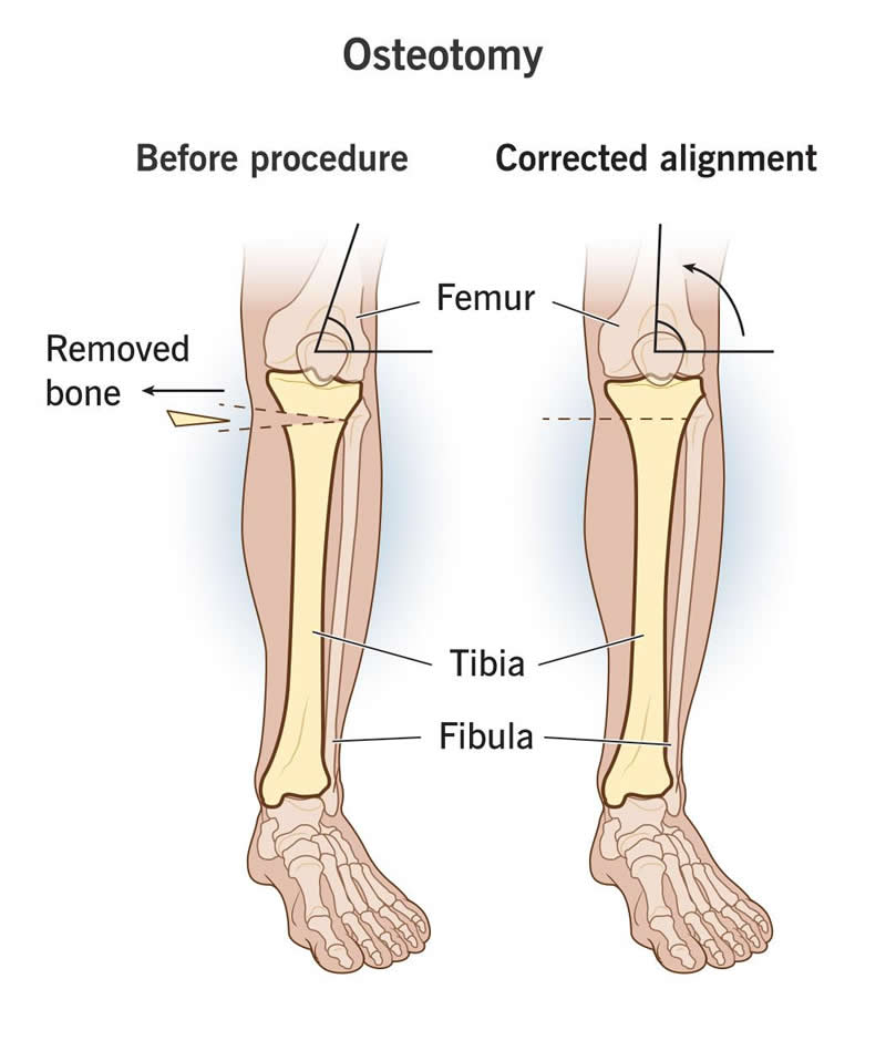 The location of the knee osteotomy depends on where the damage is. For example, in a high tibial osteotomy, cartilage damage tends to be on the inside of your knee. The surgery involves removing either a wedge of bone from the outside of your knee or opening up a wedge of bone on the inside of your knee, creating a straighter leg and preventing the progression of arthritis.