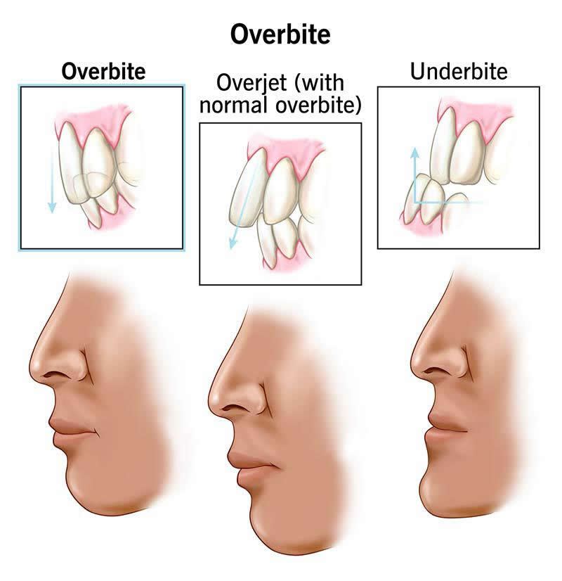 - Overbiterefers to vertical misalignment. The upper teeth overlap the lower teeth more than what’s typical. Some people call this a “deep bite.”
