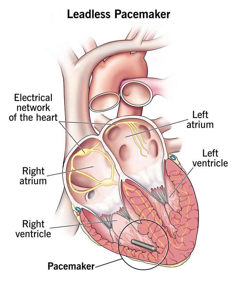 A leadless pacemaker is a small, one-piece device that a healthcare provider inserts into your heart to prevent slow heart rates. All the parts of a leadless pacemaker are inside one device. There’s no separate battery. And it doesn’t need leads (wires) because the whole device sits in your heart’s right ventricle (heart chamber).