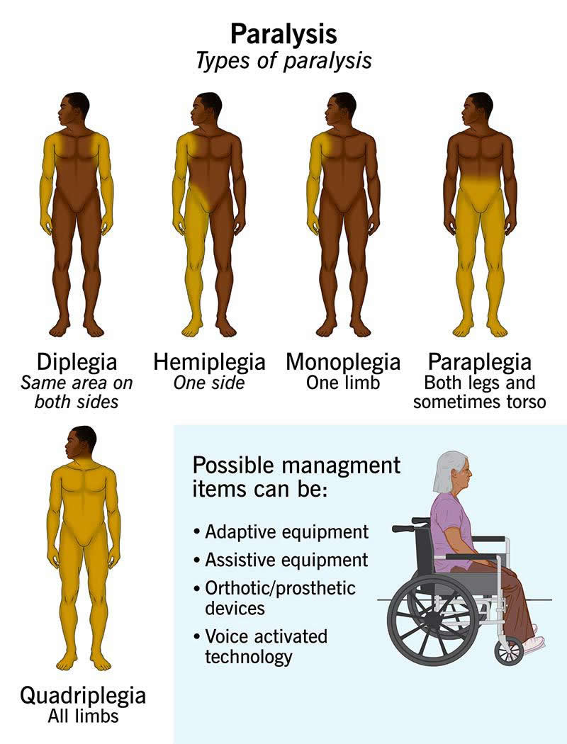 - Quadriplegia (tetraplegia): Paralysis involves all limbs and the torso. People with quadriplegia may have little or no movement from the neck down.