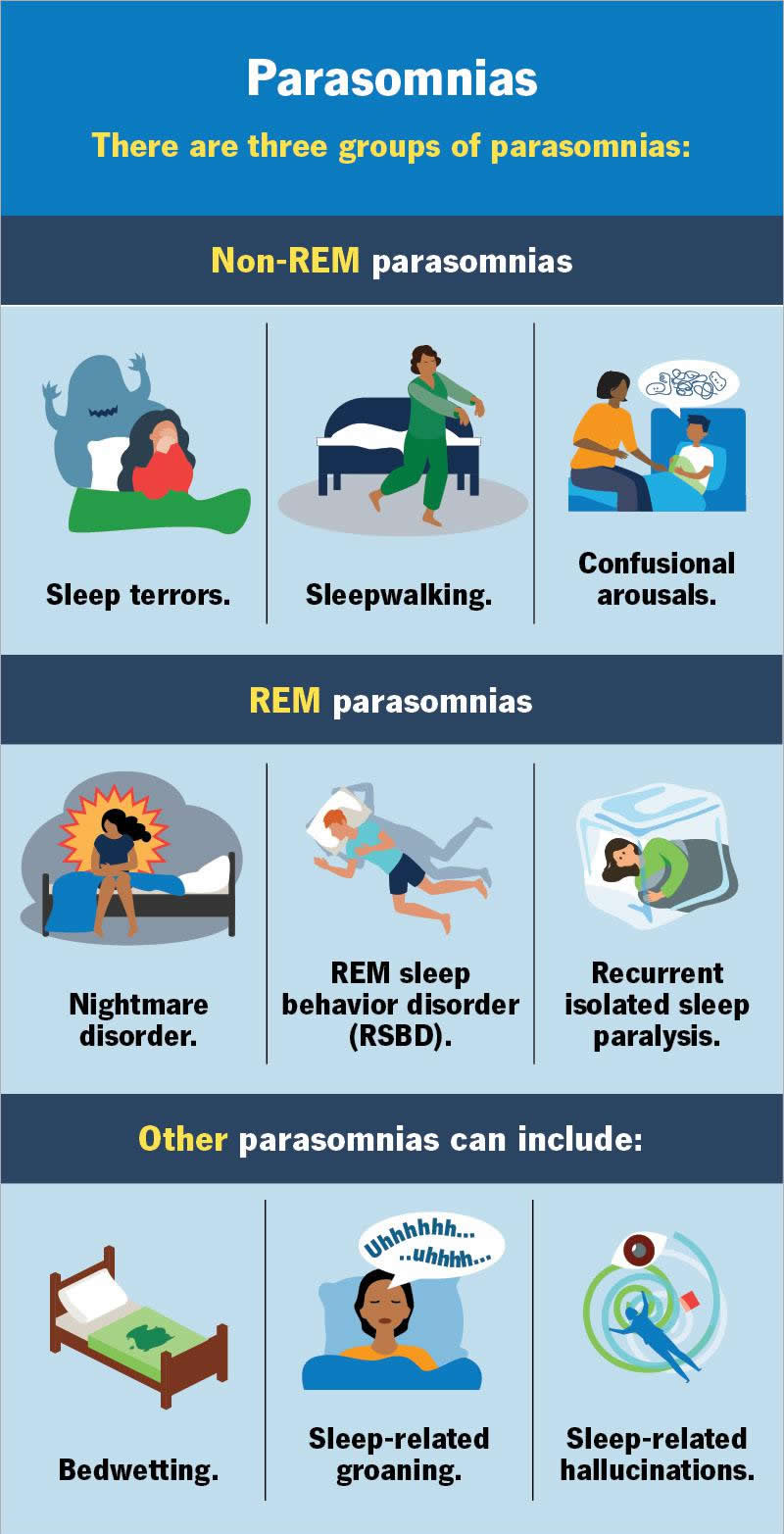 There are three main groupings of parasomnias based on the stage of sleep in which they happen.