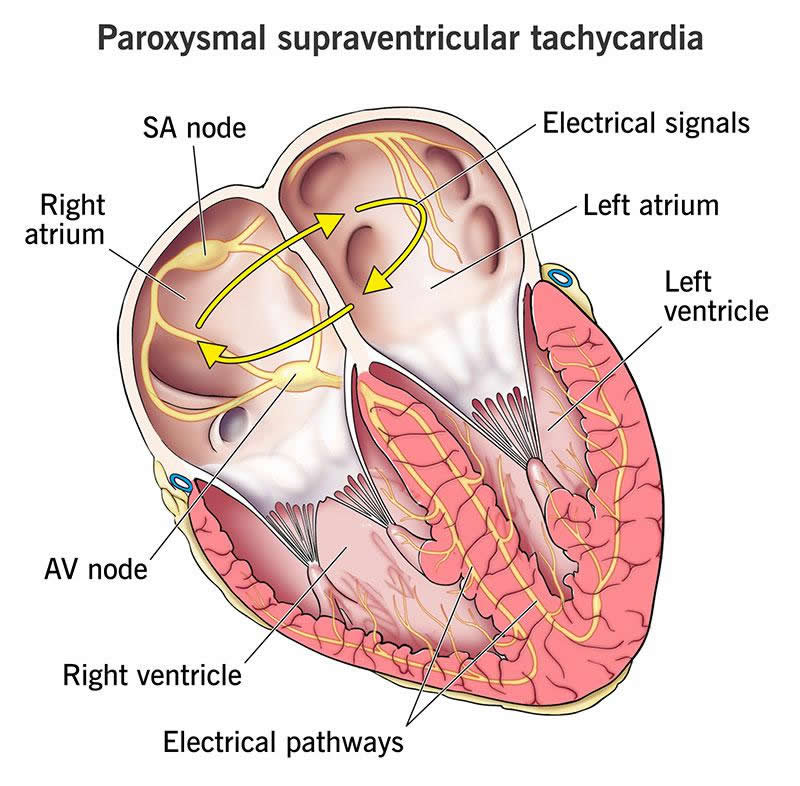 Like other types of arrhythmias, PSVT can be inherited (passed down through families). It can also develop as a result of: