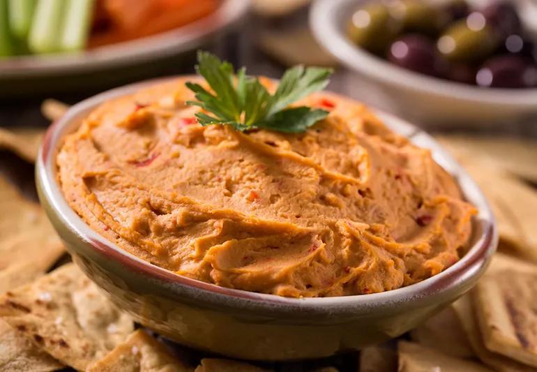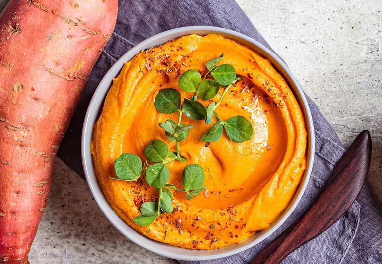 Hummus is traditionally made from chickpeas … but it doesn’t have to be! Sweet potatoes provide the base for this take on the classic spread. Roasted red peppers, garlic, cumin and cayenne pepper add some zingy pops of flavor.