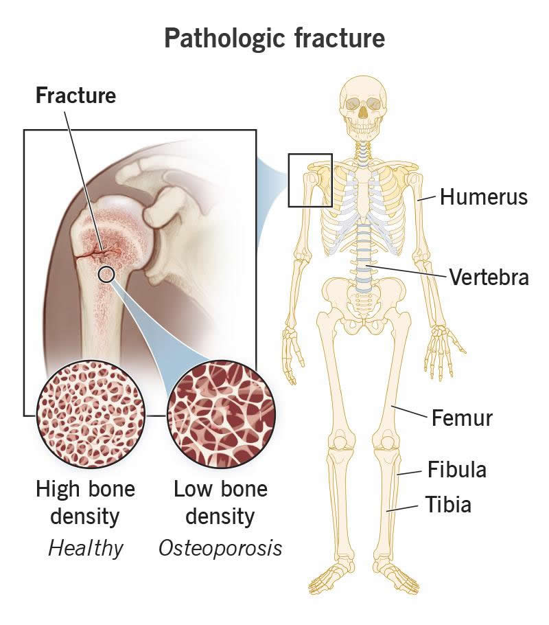 Pathologic fractures happen when something weakens one of your bones so much it breaks with much less force than usual. Osteoporosis, benign bone tumors and cancers can all weaken your bones without causing symptoms you notice or feel. Healthcare providers will treat the fracture and the condition that causes it.