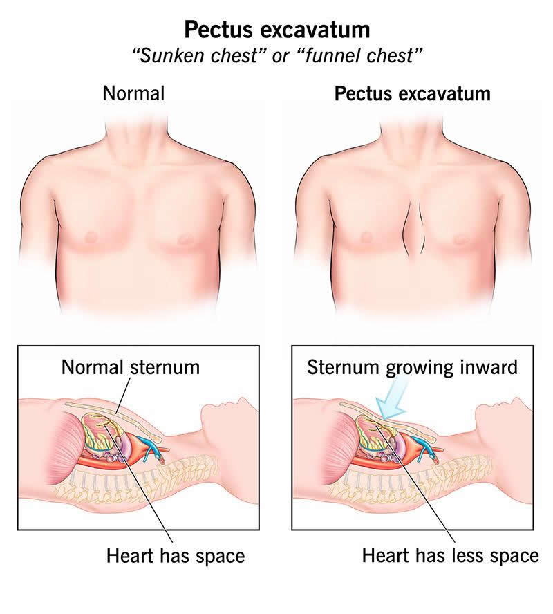 Other names for pectus excavatum are sunken chest or funnel chest. This condition gives you less space in your chest, which can limit heart and lung function.
