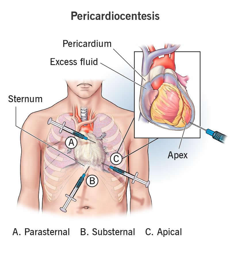 Depending on where the fluid is in your pericardium, there are several places to insert the needle. The most common location is under your sternum, also known as your breastbone. This substernal approach usually gives easy, direct access to your pericardium.