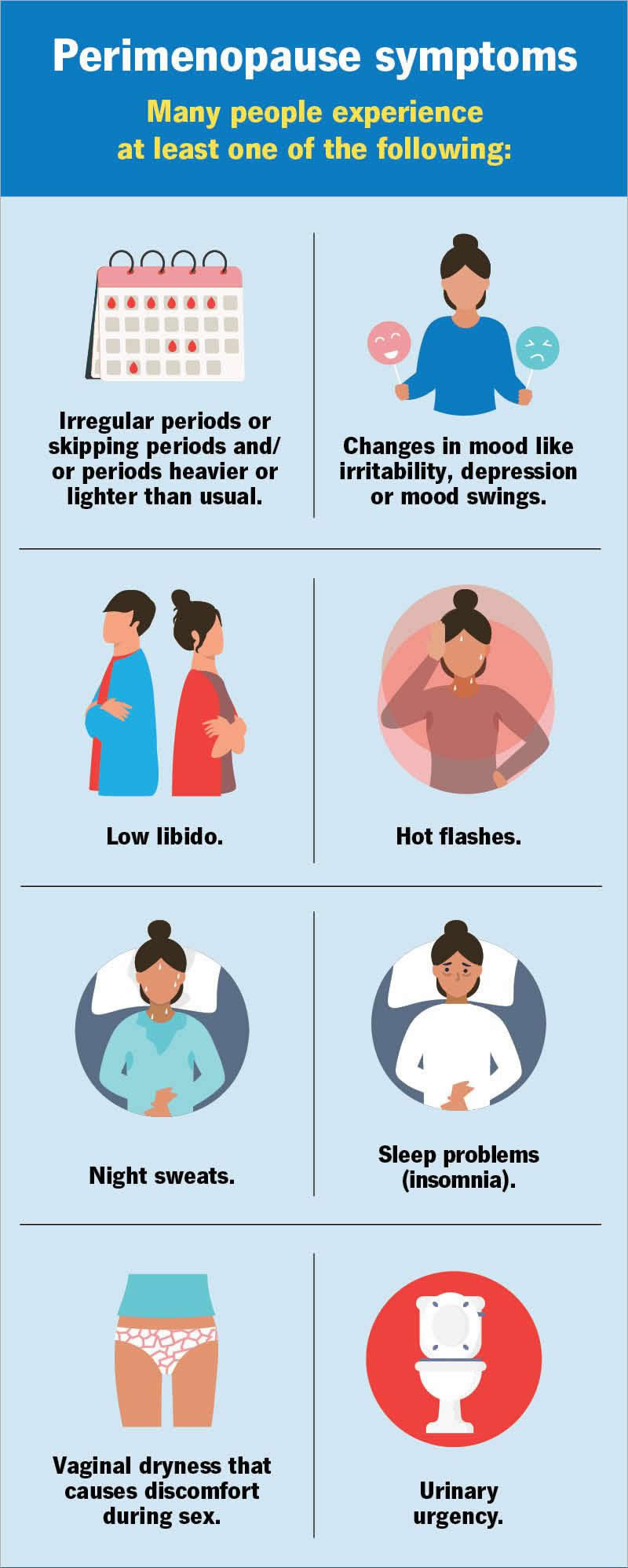Perimenopause is the transition to menopause. It’s a gradual process that can last years and it’s a different experience for everyone. Starting this new chapter of your life, where your reproductive years are ending, can be emotionally and physically challenging. You may start having menopause-like symptoms, such as irregular periods, weight changes or mood swings. Let your healthcare provider know if you believe you’ve begun perimenopause. They can help reassure you that your symptoms are normal and talk to you about the health risks of menopause like osteoporosis.