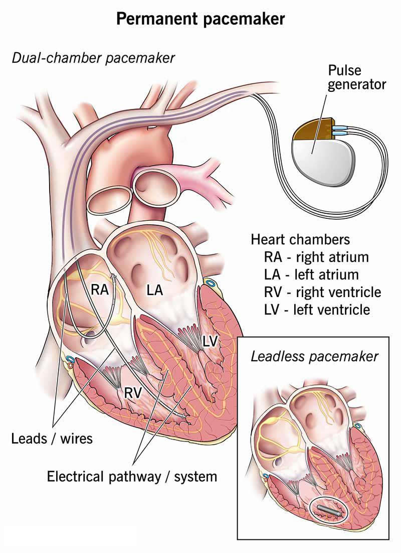 - Dual-chamber pacemaker: Uses two wires attached to two chambers of your heart.