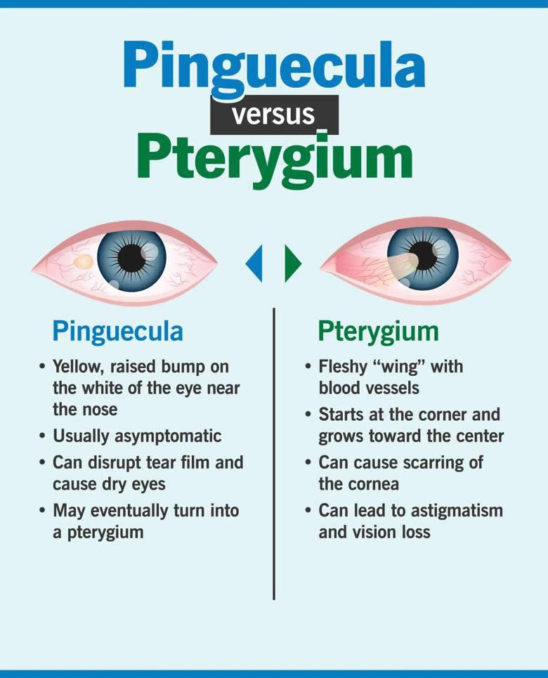 Pinguecula and pterygium are growths that appear on the conjunctiva of your eyeball (the clear film that covers and protects the white part of your eyes). They’re mostly harmless at first. But if left untreated, they could cause symptoms like pain, irritation and changes to your vision as they grow.
