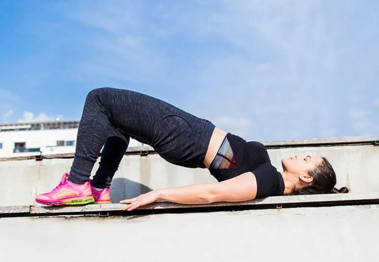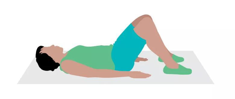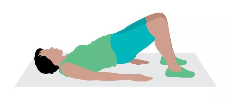 Lie on your back with your knees bent and feet flat on the floor with your arms at your sides. Squeeze your abdominal and buttocks muscles, push your heels into the floor and slowly lift your buttocks and hips off the floor. Keep your back straight. Hold for 5 to 10 seconds.
