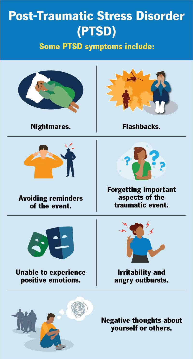 Post-traumatic stress disorder (PTSD) is a common mental health condition that can develop after a traumatic event. It involves symptoms like flashbacks, anxiety, negative thoughts and beliefs, hypervigilance and more. The main treatment for PTSD is psychotherapy (talk therapy).