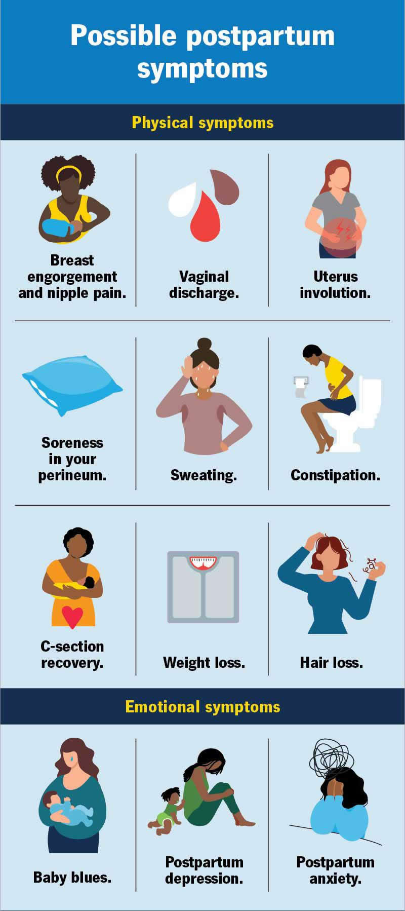 Physical symptoms in postpartum affect your body — things like what it does, what it looks like and how it feels. Some of the most common physical symptoms in postpartum are: