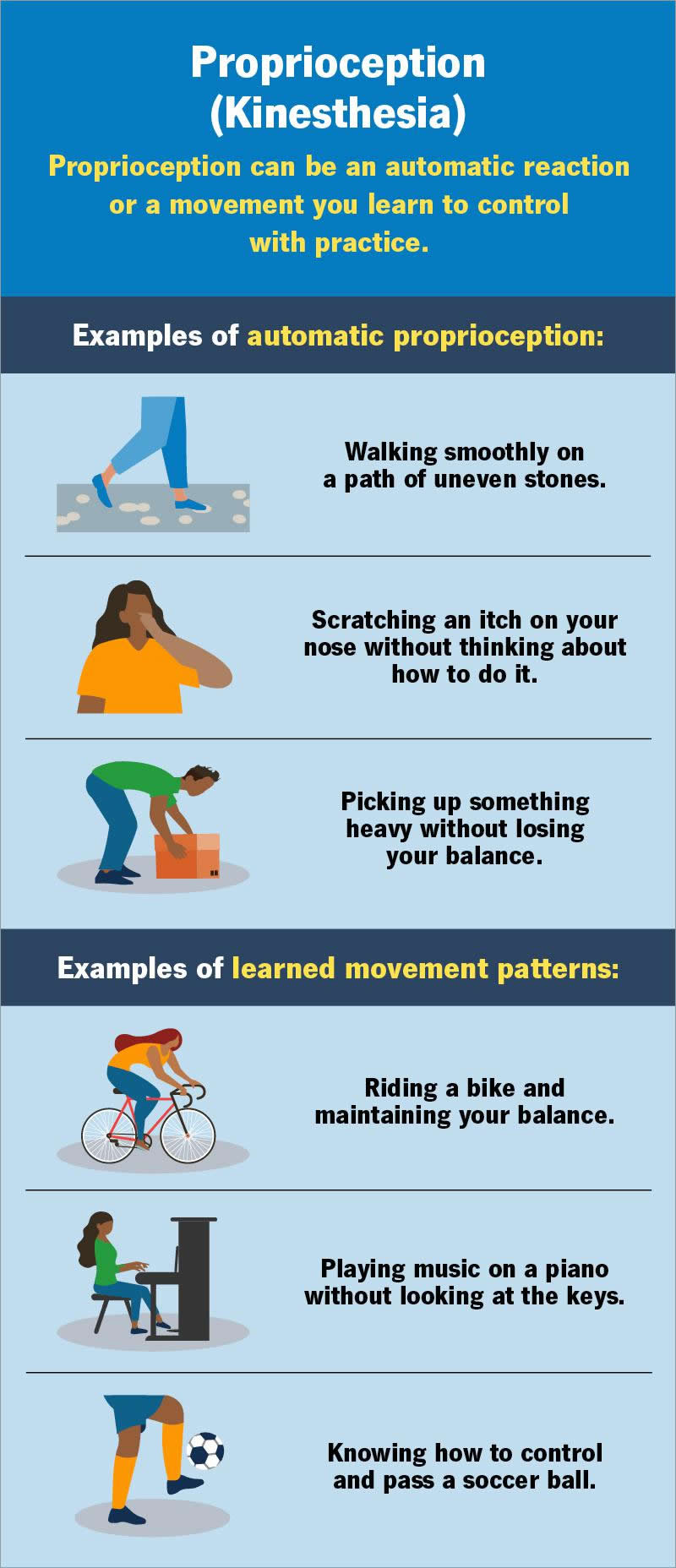 When we think of our senses, we often just think of sight, smell, hearing, touch and taste. But proprioception is another key sense that makes life easier and more enjoyable. Without effective proprioception, we wouldn’t be able to effortlessly scratch an itch or ride a bike. Many conditions and injuries can affect this important sense — either temporarily or permanently. Talk to a healthcare provider if you notice a change in your balance or how you’re able to go about physical activities. They can do some simple tests to assess your proprioception.