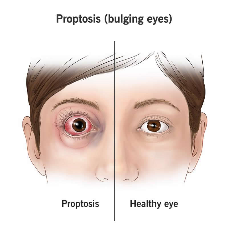 Other names for proptosis include bulging eyes, protruding eyes and exophthalmos.