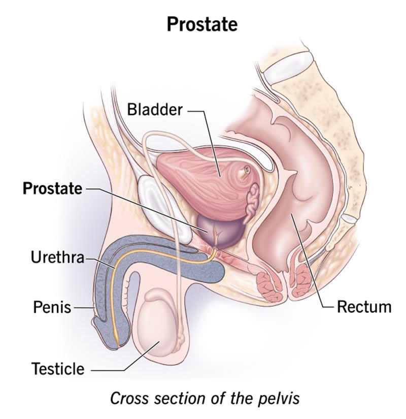 The prostate is a gland below the bladder and in front of the rectum in male. It consists of connective tissues and glandular tissues. It adds fluid to semen, and its muscles help push semen through your urethra. Conditions that affect your prostate include cancer, prostatitis and benign prostatic hyperplasia.