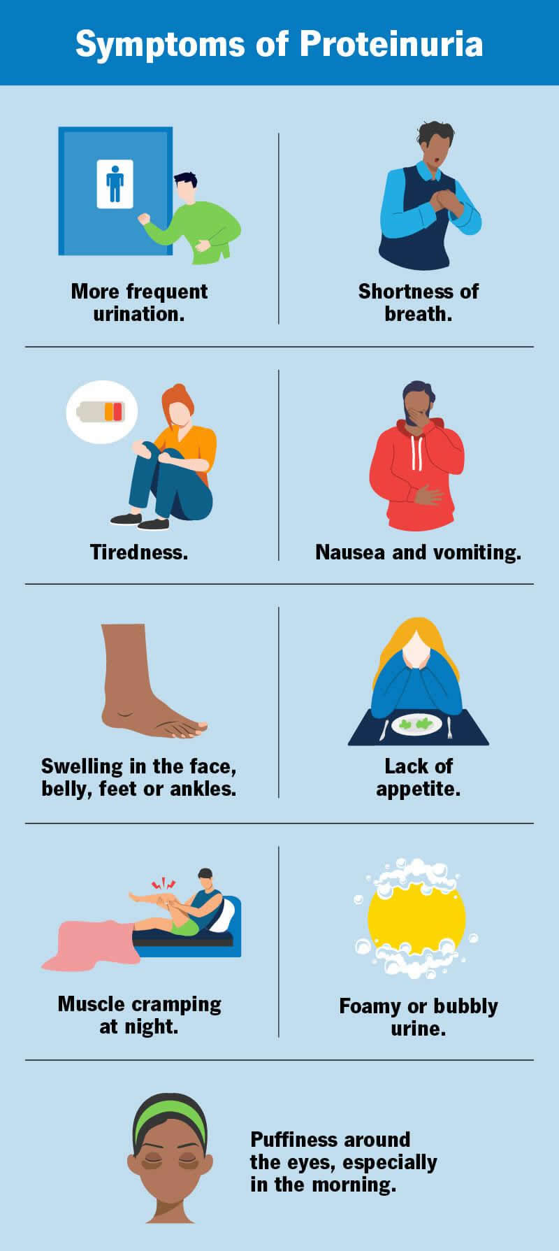 Proteinuria is high levels of protein in your pee. If you have proteinuria, you may have to pee more often, and your pee may be foamy or bubbly. You may have general feelings of illness, including nausea, vomiting, tiredness and swelling. If you have any of these symptoms for more than a few days, it’s a good idea to reach out to your healthcare provider. They can help you diagnose a condition that’s causing your proteinuria and prescribe treatments that help keep your kidneys healthy.
