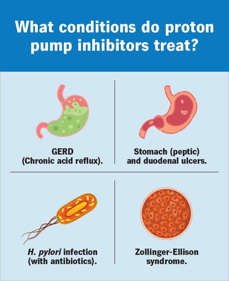 Proton pump inhibitors primarily treat conditions that arise when stomach acid irritates or damages parts of your digestive system, like your stomach, duodenum (the part of your small intestine closest to your stomach) or your food tube (esophagus). PPIs are used to treat: