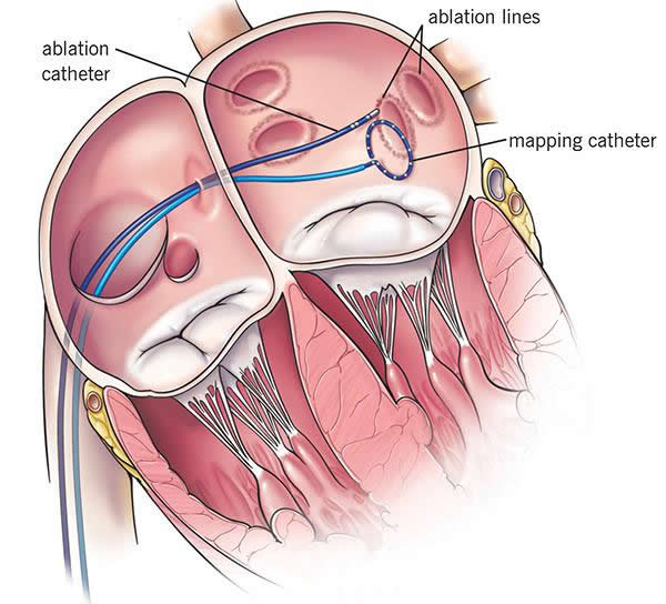 - Your provider inserts two catheters (tubes) into the incisions and advances them through a blood vessel to your left atrium.
