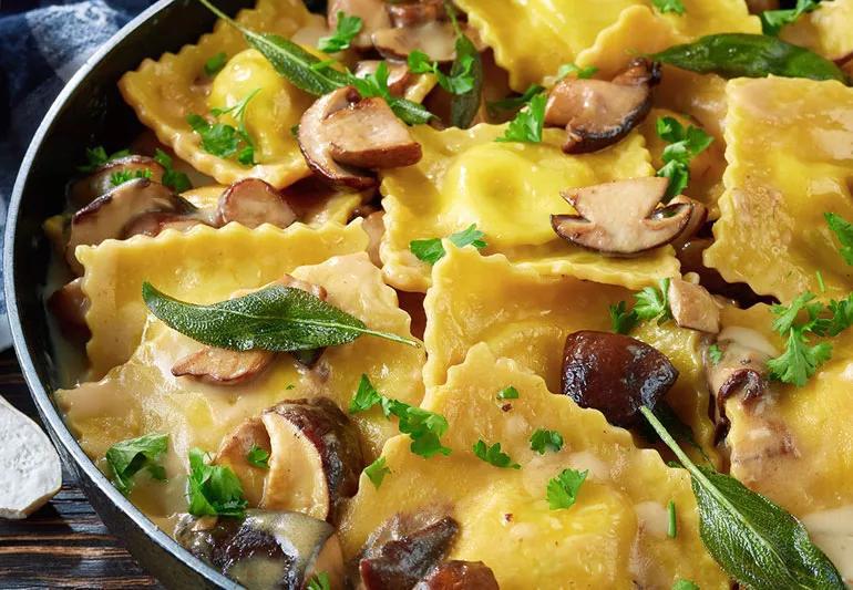 What’s in your ravioli? Why not make pumpkin the answer. Wow your dinner guests with ravioli filled with a savory pumpkin mousse and serve it in a broth made from an assortment of mushrooms.