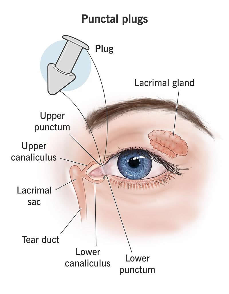The puncta are like drains that send tears into the nasolacrimal duct, which drains into your nose (which is why you get nasal congestion when you cry). Punctal plugs block the puncta, keeping tears from flowing out.