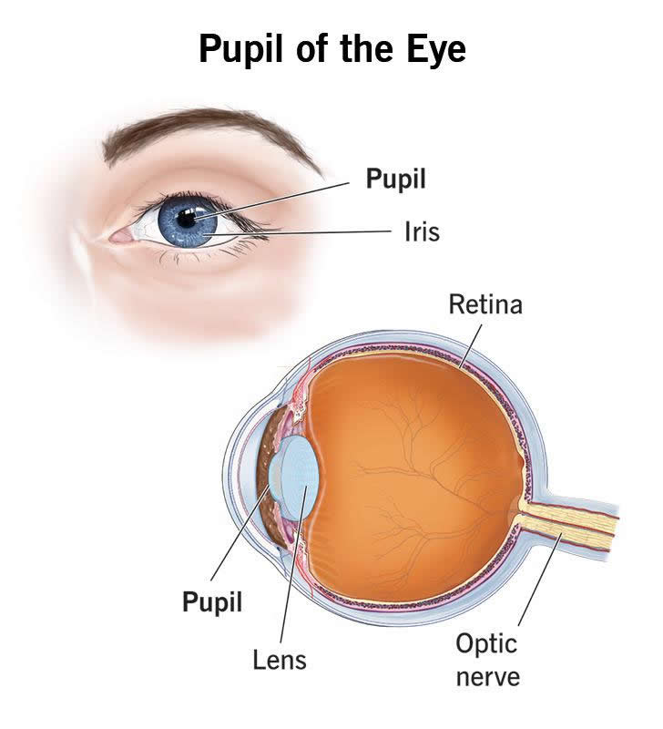 The pupil is the black opening in the middle of the colored part of your eye (iris). The pupil gets bigger or smaller in response to changes in light. Muscles in the iris control the size of the pupil. Pupil issues can suggest certain diseases.