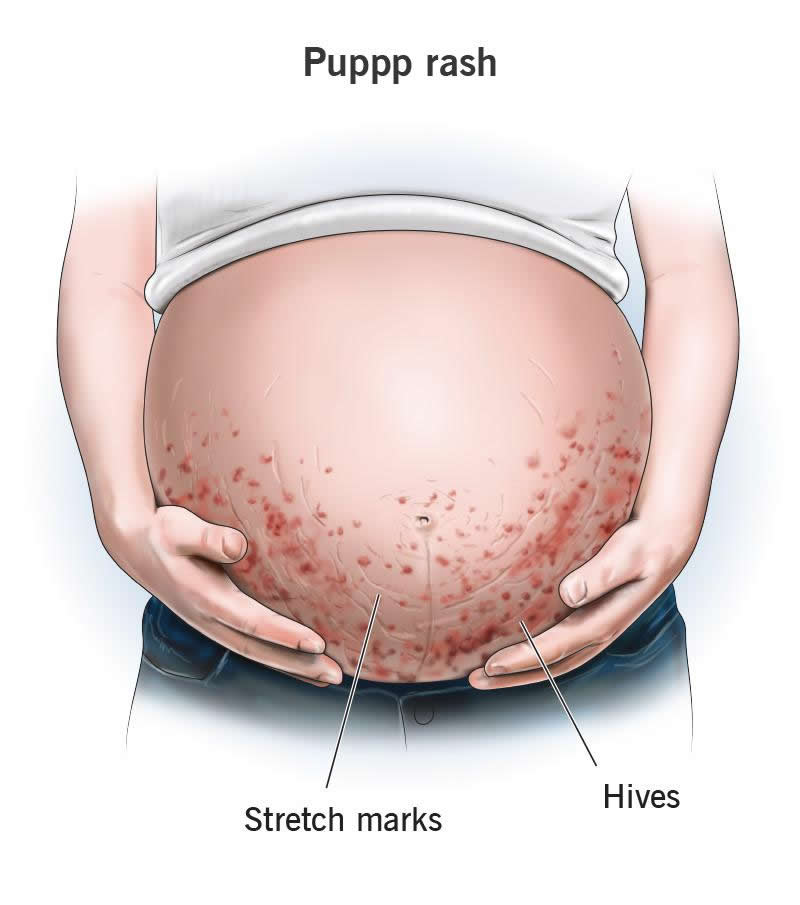 PUPPP is an itchy rash that can happen during pregnancy. The letters PUPPP stand for “pruritic urticarial papules and plaques of pregnancy.” PUPPP rash is a patch of itchy, hive-like bumps that form in the stretch marks on your belly. It can spread to other parts of your body, like your thighs, breasts and arms.