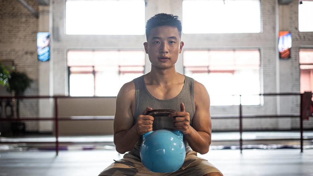- Hold a dumbbell or kettlebell in your hands, at your chest.