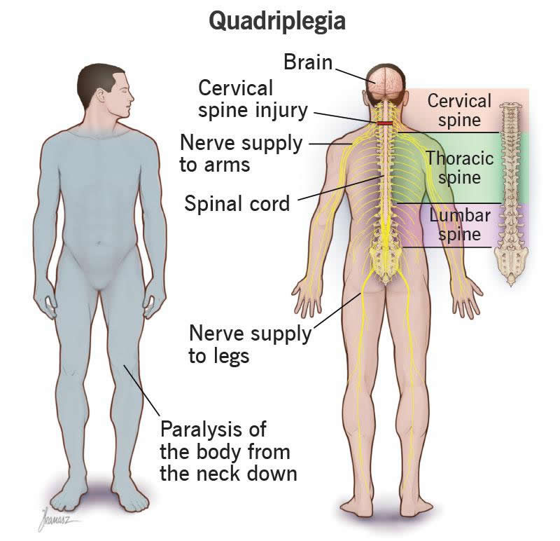 Healthcare providers use a letter-number combination to talk about sections of the spine and related spinal nerves. For example, the fifth cervical spinal nerve is known as C5. Quadriplegia can happen when there’s a complete or incomplete spinal cord injury anywhere between C1 and C8. The higher the injury, the more dangerous the effects.
