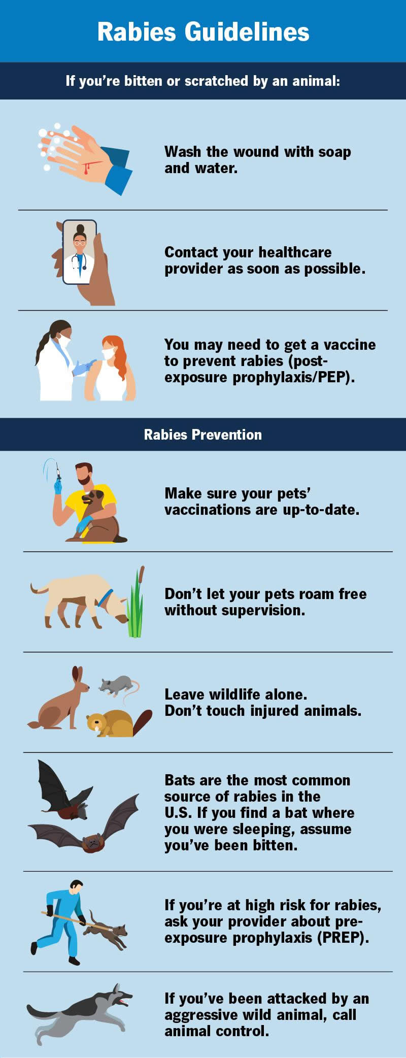 - If you’re bitten or scratched by a wild animal or have been exposed to rabies in some other way, contact a healthcare provider as soon as possible.