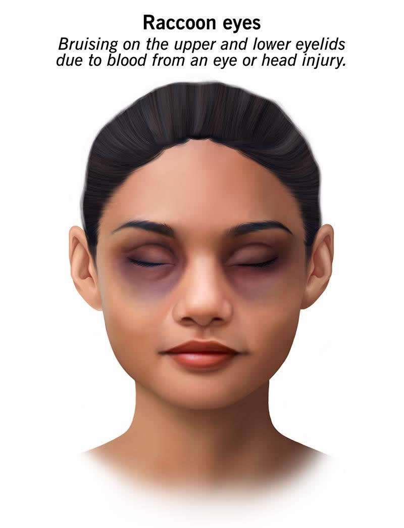 Raccoon eyes on their own don’t need treatment but what caused them usually does. A healthcare provider will offer imaging tests and blood tests to determine what caused them. You may need to be assessed for a concussion. Then, they’ll determine what type of treatment is best for your situation. For example, you may need surgery to mend a fracture or relieve pressure on your brain. Antivirals can treat an infection. You may need rest and ice (to reduce swelling) for non-severe head injuries.