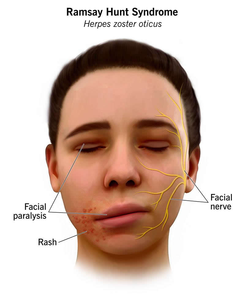 Ramsay Hunt syndrome, or herpes zoster oticus, occurs when the varicella-zoster virus (shingles) reactivates and spreads to the facial nerves near your inner ear. The varicella-zoster virus is the same virus that causes chickenpox and shingles (herpes zoster). Treatment for the condition may include medications including antivirals and corticosteroids.