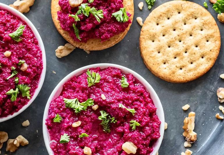 This surprisingly sweet dip — made from delicious raw beets — is great with vegetables or whole-grain crackers or as a topping on a piece of salmon. Use it as part of a vegetable platter pre-dinner or for a snack.