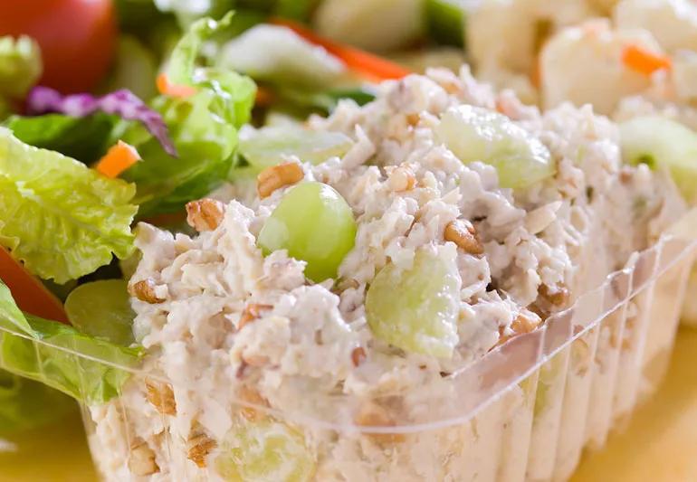 This is not your everyday chicken salad. Adding red seedless grapes and pecan or walnut pieces to the mix, along with flavorful Dijon mustard and fresh parsley, make it a standout.