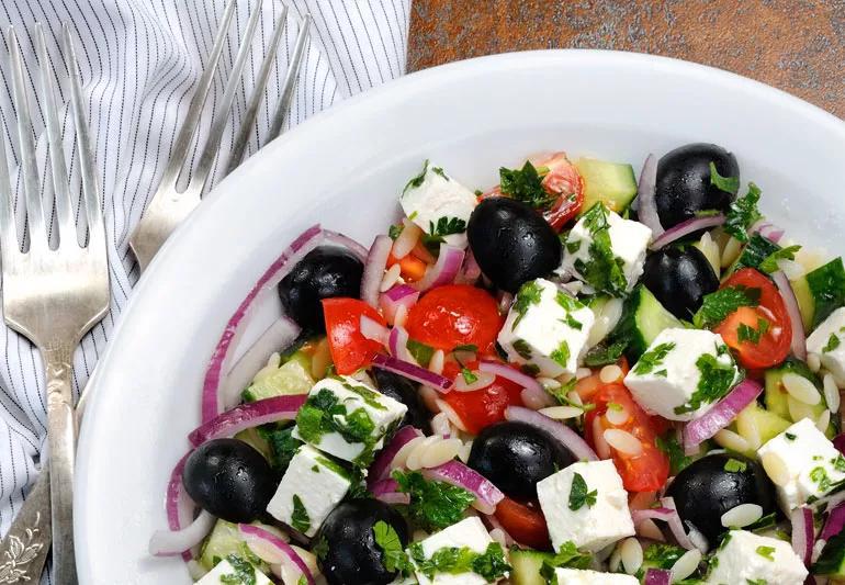 Combining low-fat feta and tofu makes for a lighter, healthier Greek salad. Serve this salad on lettuce leaves garnished with toasted whole-grain bread.