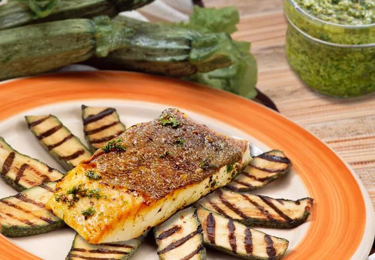 Recipe: Grilled Halibut and Zucchini With Green Olive Salsa Verde