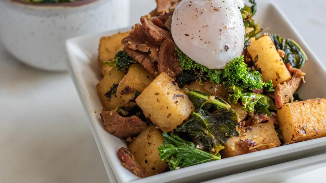 - Divide hash into four bowls. Place two eggs over each serving and garnish with avocado slices.