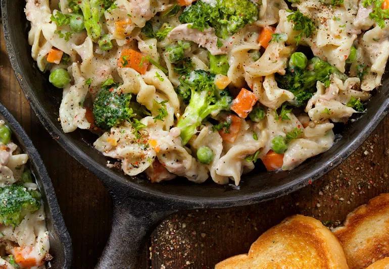 This lighter chicken noodle casserole includes a creamy base but with fewer calories and fat. It offers niacin, a B vitamin that helps increase HDL (your good cholesterol) levels in the blood, and folate which assists in DNA and RNA production. It’s also high in vitamin C.