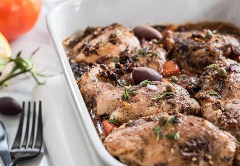 Looking for a new spin on the same old chicken dinner? Try this Mediterranean variation, which is low in saturated fat and rich in flavor. Dark meat doesn’t dry out as easily as white meat, so these baked chicken thighs stay moist. Serve with a starch and a vegetable to make a balanced meal.