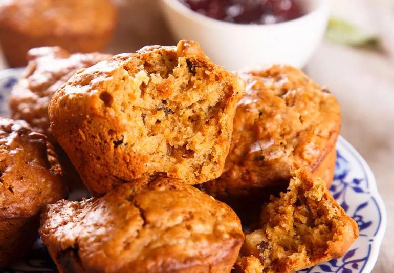 - Fold in the zucchini, carrot, walnuts, raisins and dates. Save a few walnut pieces to top the muffins.