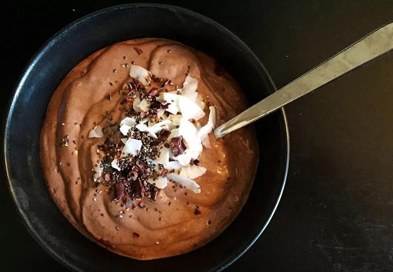 This pudding is packed with health-promoting chia seeds, almond milk, cinnamon, cocoa, coconut flakes and dried fruit. It’s the perfect chocolate treat.