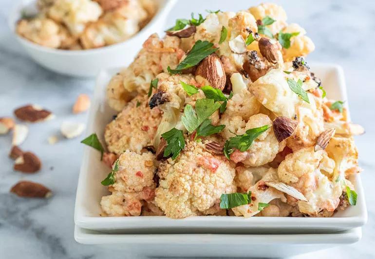 - Serve the cauliflower topped with the red pepper sauce, almonds and parsley.