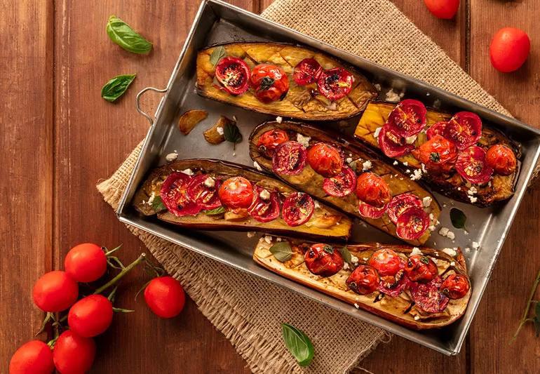- Cut the eggplant lengthwise in half. Score the inside flesh in a crosshatch pattern without cutting through the skin. Brush the flesh with the remaining 2 teaspoons oil and season with the black pepper and remaining salt. Place cut-side down on the sheet pan, and roast 45 to 55 minutes until the eggplant are tender and the tomatoes burst.