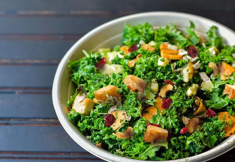 - While veggies are roasting, mix kale, cranberries, 1 teaspoon olive oil and 1/2 teaspoon salt in a bowl. Set aside.