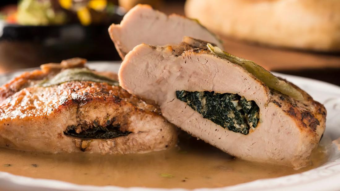 Try this lighter pork chop recipe. Pork loin makes it leaner than traditional pork chops, and stuffing these chops with vegetables offers a burst of flavor in every bite.