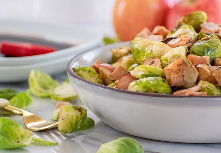 Brussels sprouts are a cruciferous vegetable, making them a good source of phytonutrients, as well as fiber and vitamin C. Apple and balsamic vinegar lend a tasty twist to this enticing recipe, with a bit of ham for an added burst of flavor.