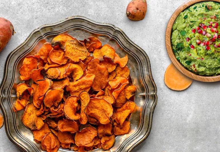 Recipe: Sweet Potato Chips and Guacamole With Pomegranate and Edamame