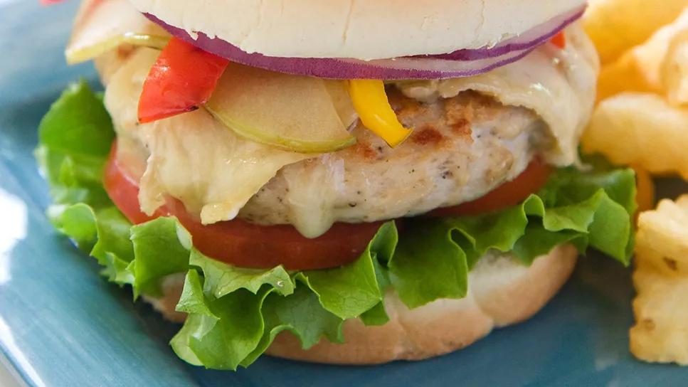 We prepared these tasty burgers in the skillet, but you could cook them on your grill, too. If you’re making them for children, you may want to serve the apples and veggies raw and on the side instead of on top of the burger — some kids prefer their fruit and veggies that way. And don’t forget to purchase ground white meat turkey. Not all ground turkey is lean, so be choosy, too!