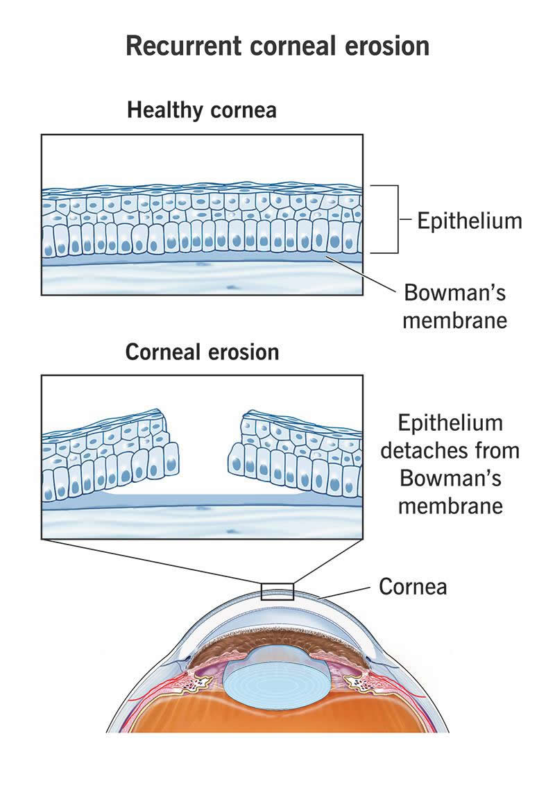 When you have RCE, the epithelium and Bowman’s membrane don’t stick together as they should. That can cause the epithelium to erode, exposing vulnerable layers underneath. And corneal erosions are very painful because the epithelium is packed with nerve endings.